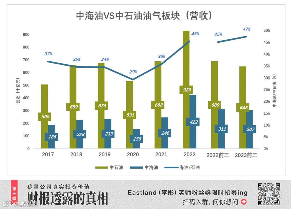 2023年前三季,中海油营收3068亿,同比下降1.4%;中石油油气板块营收6478亿,同比下降6%;至此,中海油营收已达中石油油气板块营收的47%。