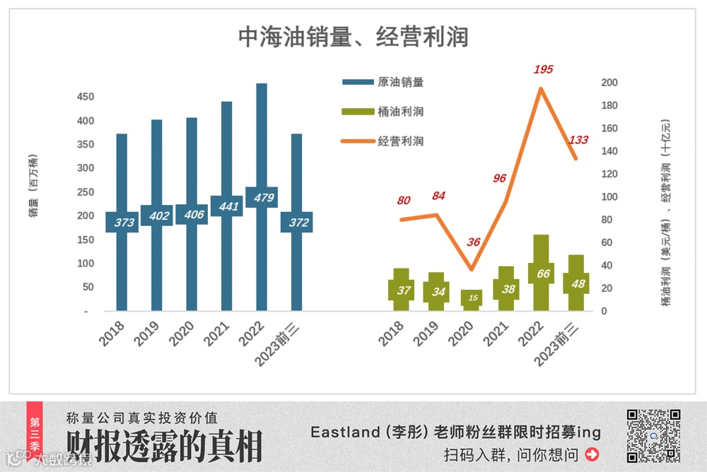 2022年,中海油销量4.8亿桶,较2018年提高28%;桶油利润达66美元,较2018年提高80%;经营利润1949亿,较2018年提高143%。