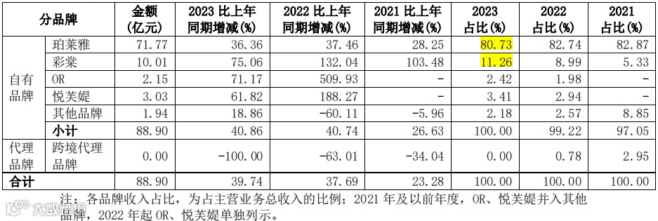 其中,公司定位熟龄肌抗衰的“红宝石精华”、氧糖双抗的“双抗精华”和敏感肌群体也可用的“源力修护精华”等大单品均是主品牌“珀莱雅”旗下的产品,也驱动主品牌“珀莱雅”收入不断增长。