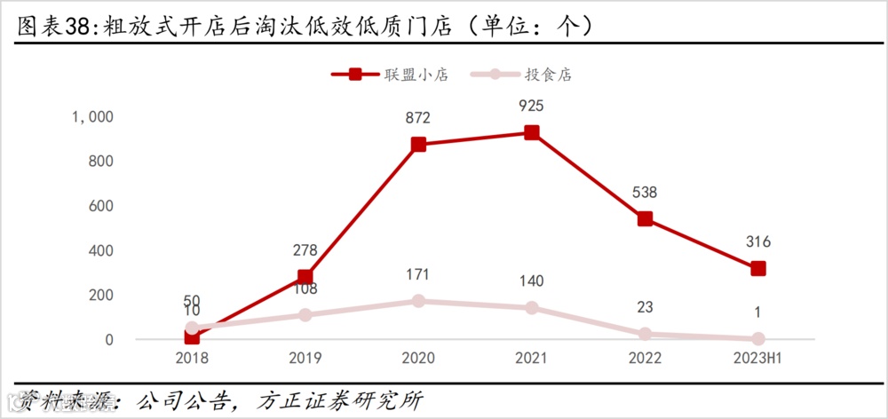 此前三只松鼠线下门店受前期粗放扩张及疫情影响,门店效益下滑。2022年起三只松鼠逐步优化低效低质门店,联盟小店、投食店分别从2021年的925家、140家下降至2023上半年的316家、1家。
