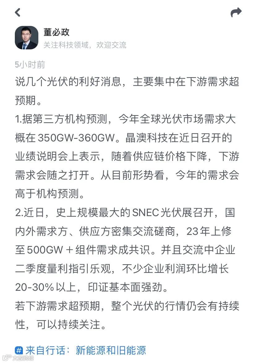 而今天光伏板块的反弹,正是因为下游需求超预期,董老师在妙投的行话板块中表示,相关方面的利好消息。(感兴趣的朋友,可以下载妙投app,与研究员直接交流)
