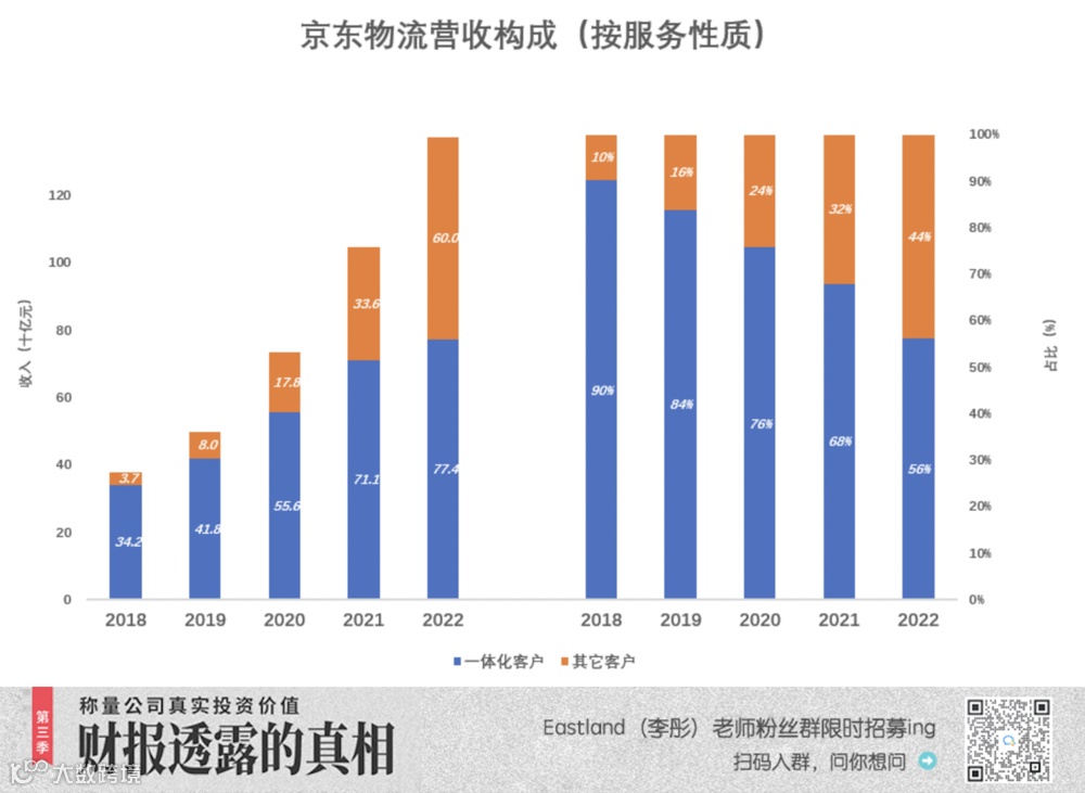 2018年~2022年,“一体化”客户贡献的收入占比从90%降至56%,原因是“一体化”最大的客户——京东贡献的收入占比下降。