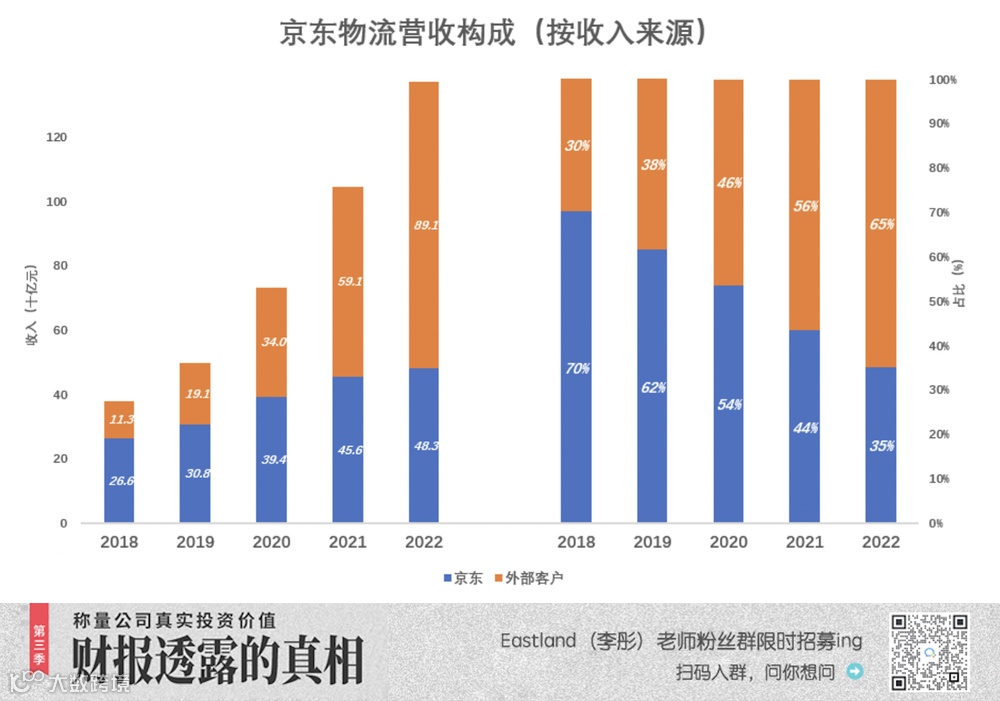 2022年京东贡献营收483亿、占京东物流总营收的35%,降至2018年的一半。