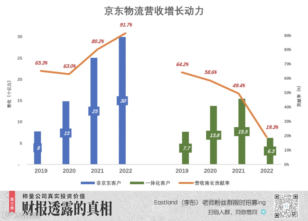 从另一个维度看,2022年来自一体化供应链客户的营收为774亿、同比增幅仅8.9%,对京东物流营收增长的贡献率为19.3%。