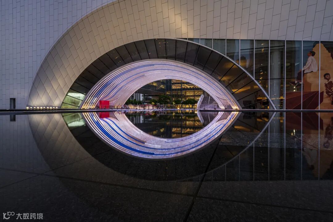 上图是入夜时分我拍摄的光明文化艺术中心局部图,我借助水面的倒影和对称式构图法,使画面中形成了宛如眼睛的形态,提升了作品的趣味性。