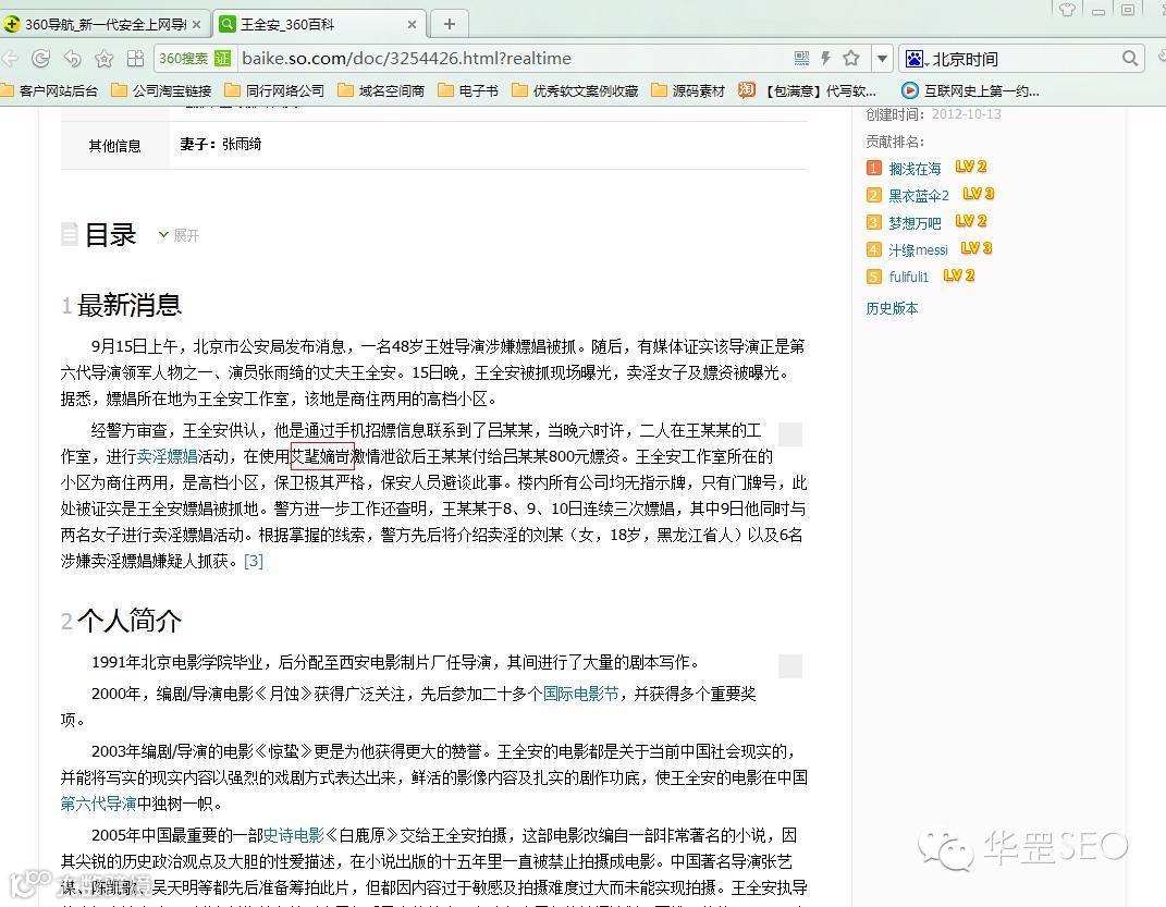 这张图是360导航2014年9月17日的首页,请注意看中间位置有一个巨大的王全安专题,下面有一个【王全安其人】的链接,这个链接是链接到360百科王全安词条。如下图