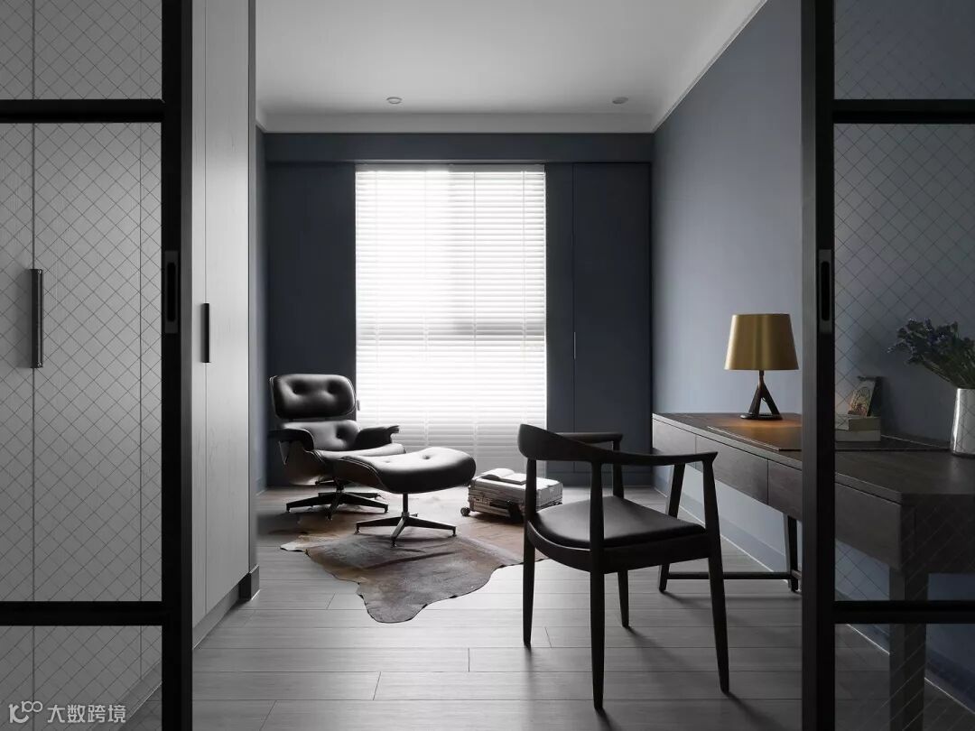 穿过客餐厅除了看到两幅黑框黑白色调的装饰画,紧接着就能看到房主的休闲室,休闲室的房门选择的是推拉门,玻璃隔断做了网格处理,有种铁丝网门即视感。玻璃推拉门显得空间通透,让走廊显得宽敞许多。