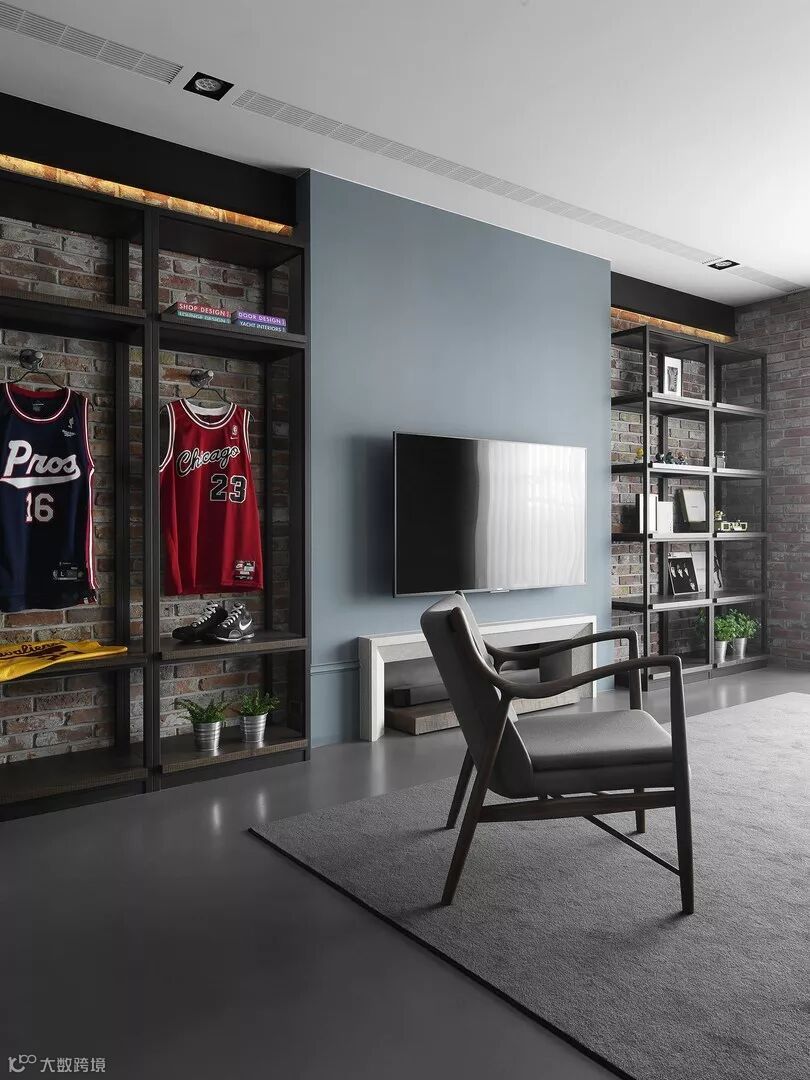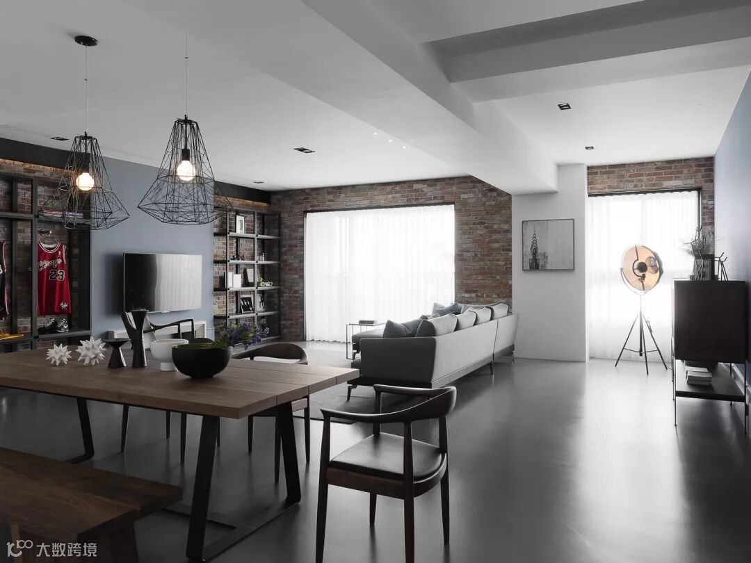 电视选择壁挂在雾霾蓝颜色的墙上,背景干净素雅,电视下方的电视柜做了内嵌的处理,接缝处做了包边,缩小占地面积也实现基本收纳需求。电视机的另一侧摆放着黑色铁质的置物架和入门处的储物架形成呼应,也担当空间过渡的功能,从这边的置物架到窗户这一片区域直接保留墙体原貌,朴素自然,白色的窗帘中和墙体本色的厚重,和客厅整体空间融为一体。