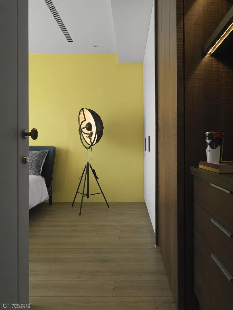 次卧的颜色比较鲜艳,但是搭配简洁,即使不喜欢颜色鲜艳的房主也对此十分欣赏,明黄色的墙面,蓝色的布艺席梦思,灰色粗布枕头,白色棉麻材质的被套,整体搭配合宜,随手一拍都是一幅画!带着三脚架的半圆形罩灯,成功引起小编注意,一盏灯点亮一间房,放那摆着光看就是一种享受!