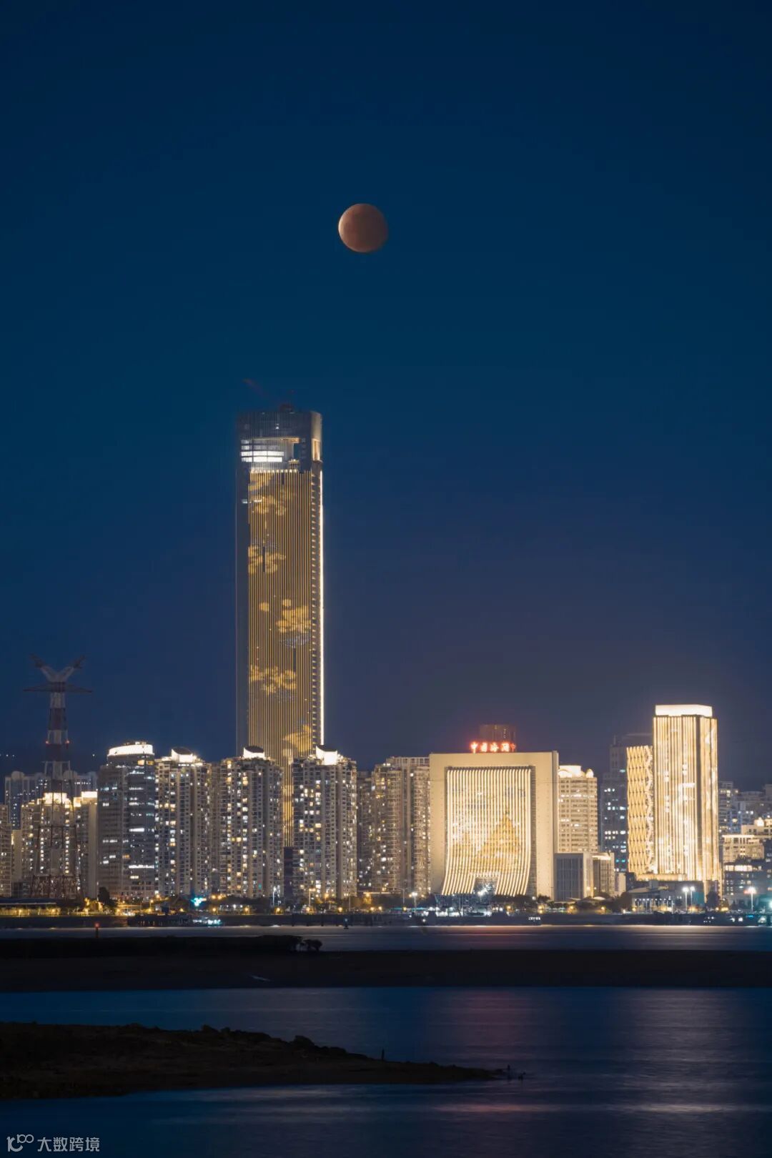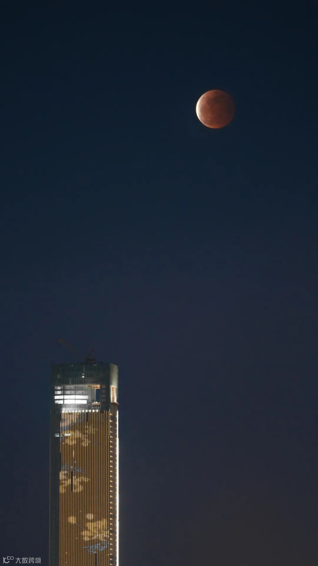 19点17分一轮食甚阶段的超级红月出现在厦门国际中心楼顶,由于是蓝调阶段和雾霾以及少许云的影响显得月亮比较暗淡。此时ISO已经开到了10000,得益于 Alpha 1的先进的影像处理系统,噪点表现非常优秀。