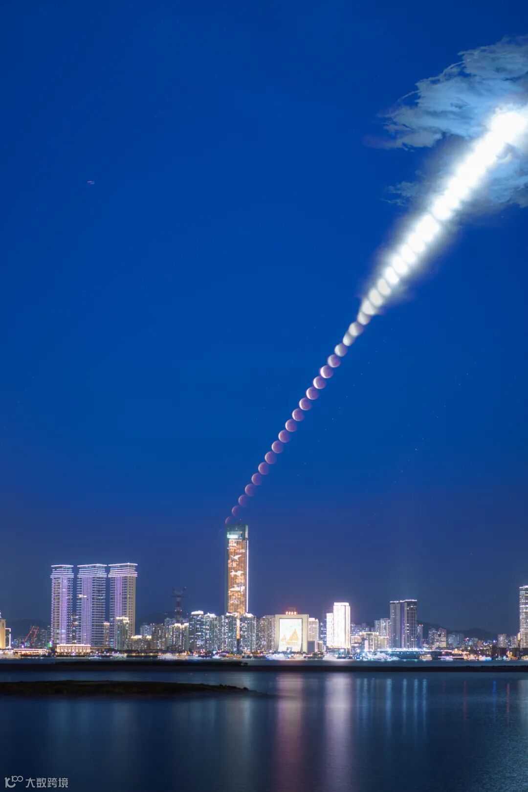 将月全食的过程经PS都叠加在一张画面里可以得到一组月亮串串的序列。每个月亮间隔6分钟拍摄。