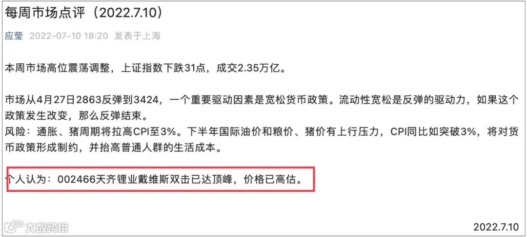 今天“私募一哥”的夫人应莹周末发布的股市点评冲上热搜,前一天在其发布的周市场点评中认为天齐锂业戴维斯双击已达顶峰,价格已高估。