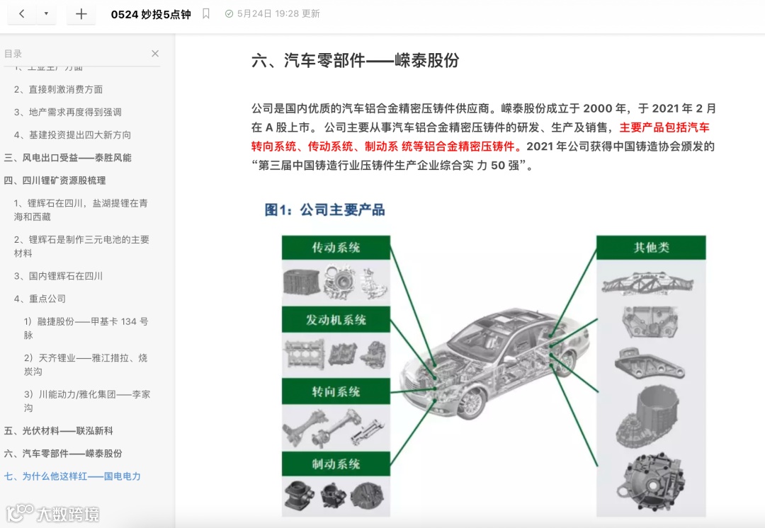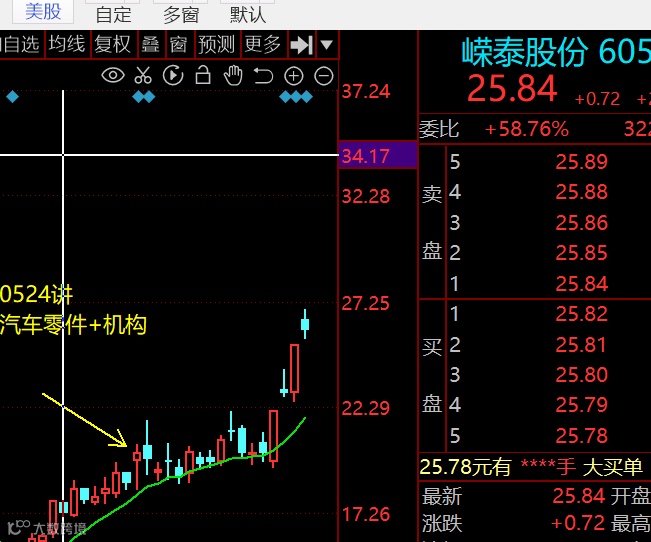 在5月24日的直播中,我们分析汽车产业链——汽车零部件,提到的相关股票——嵘泰股份,直播结束后一直处在上涨的态势,目前已经累计上涨了41.92%。