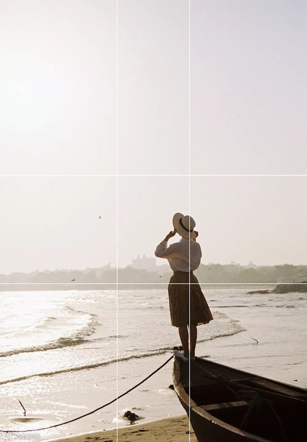 这张照片是采用黄金九宫格的构图方法,在夕阳的时候拍摄,逆光正好将人物在背景中突出出来,人物主体在了黄金比例的交叉点上,海平面的位置也处于黄金比例的横线处,船的方向与模特的视线方向一致,正好处于对角线位置,使画面有了延伸的视觉效果。