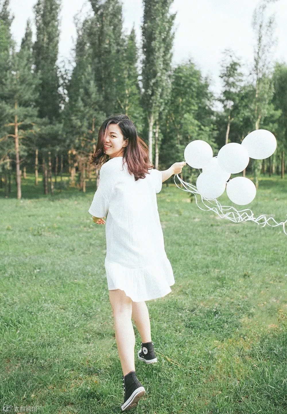 画面中的人物在奔跑的步伐,飘起的发丝和气球,让画面变得活泼自然,很好的表达照片主题中轻松快乐的氛围,在拍摄清新类的片子时可以多利用这种动态,让画面更生动。