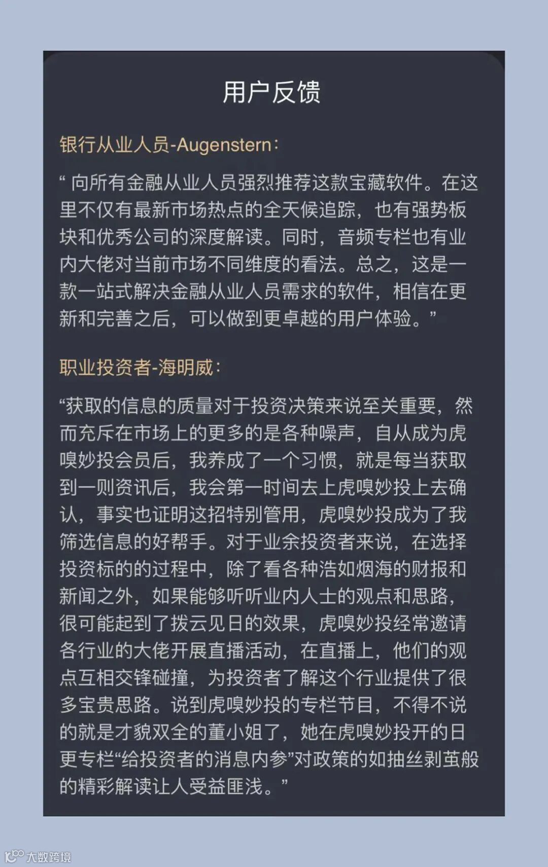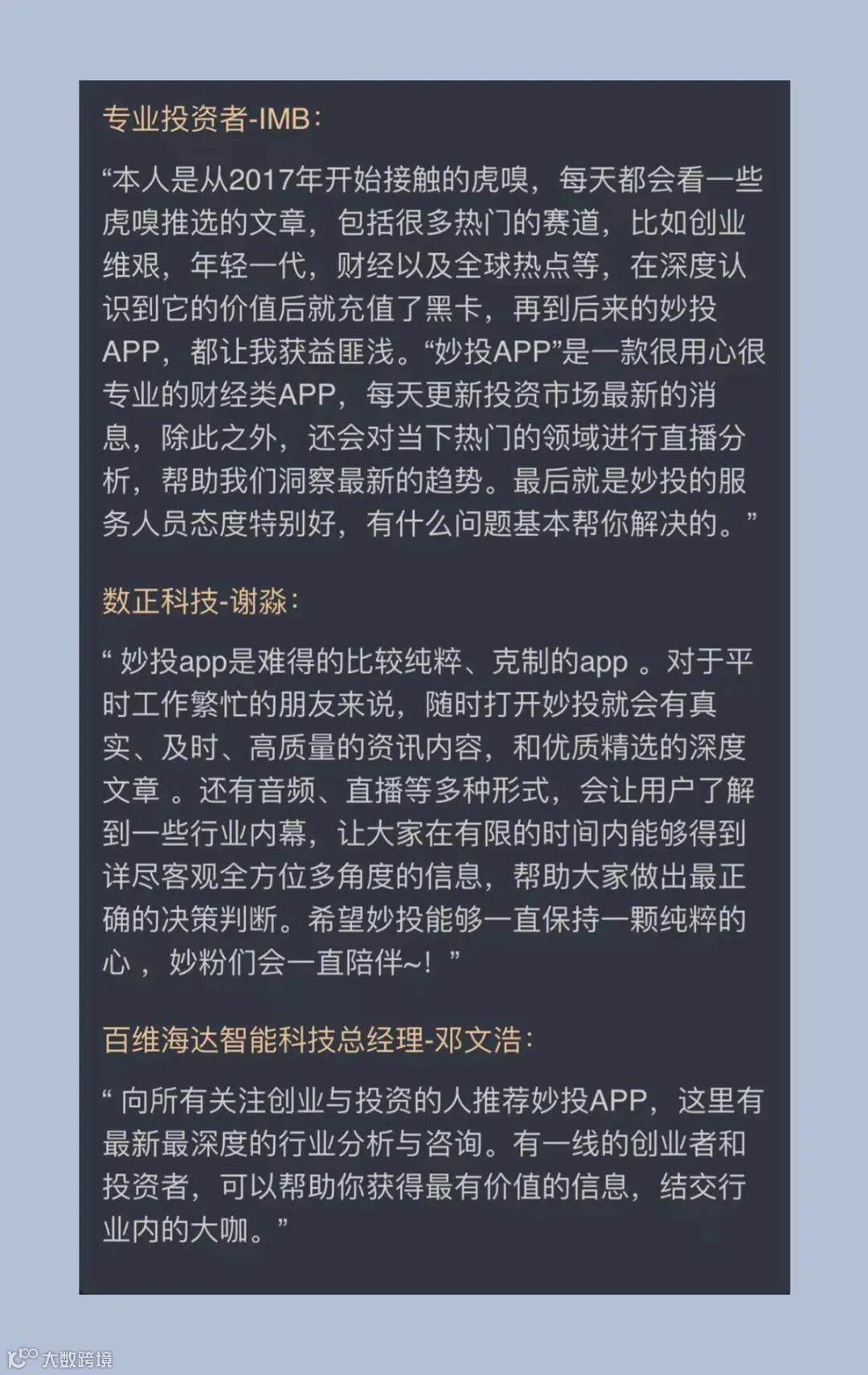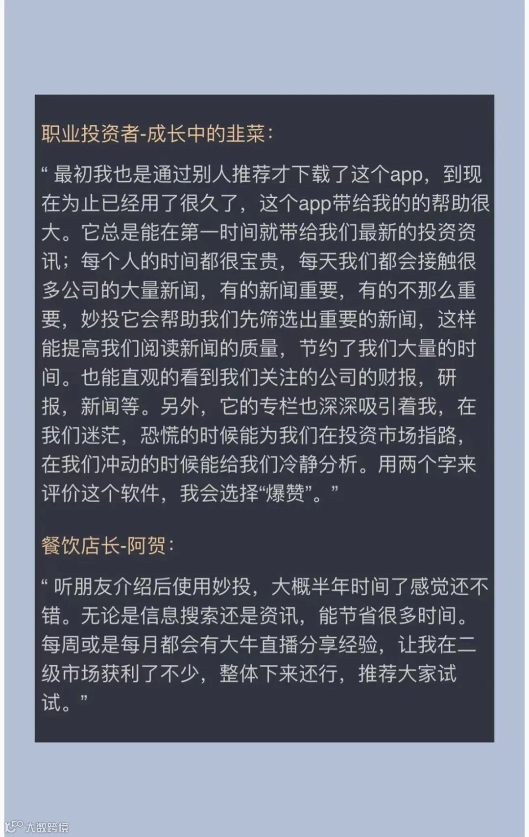 到目前,妙投APP已经深入研究分析了15000+上市公司的投资价值,解锁了281篇万字长文的公司深案例分析,精选了7X24全天候重要财经资讯,上线了200场行业大咖直播……