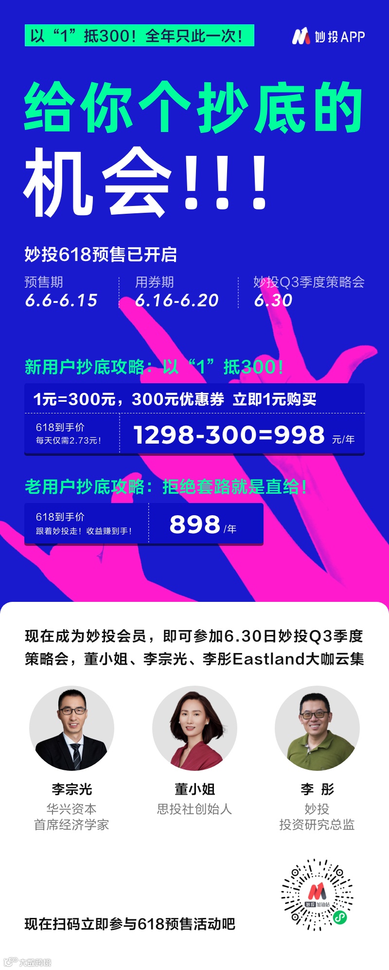 最重要的是,这次618抄底买了妙投年卡,还可以参加即将到来的6月30号的【妙投季度策略会】,数十位行业专家、经济学家、妙投研究员将会在策略会上分享他们对二季度的总结和对三季度经济发展的思考,带大家提前抓住Q3的投资机会。