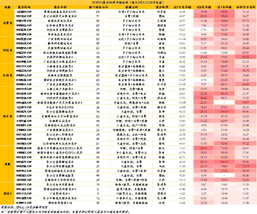 本周更新的TOP1%基金经理池业绩追踪如下,全市场通杀情况下,所有基金经理都出现了明显的回撤,总体来看业绩跌幅比较大的主要还是科技、医药两个方向的基金,这主要是市场行情的转向,与基金经理关系不大。