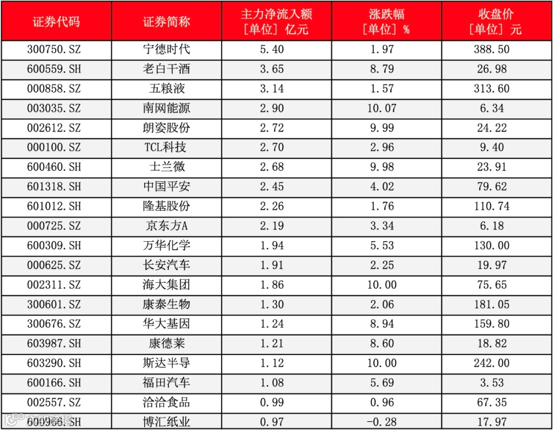 主力净流入前二十:
