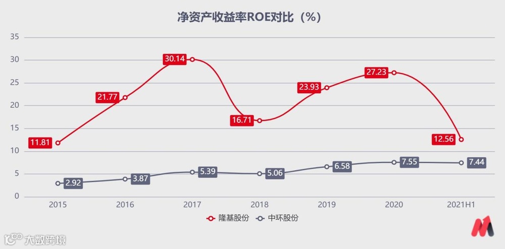 隆基股份上半年的加权平均净资产收益率为12.56%;中环则是7.44%。虽然短期仍不如隆基,但是很明显,中环的盈利能力较以前已经有了很大的改善。