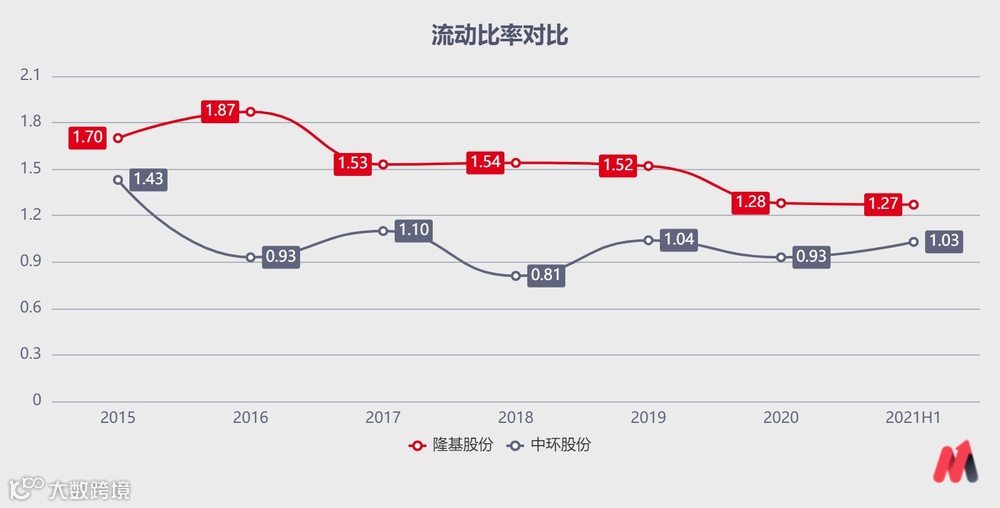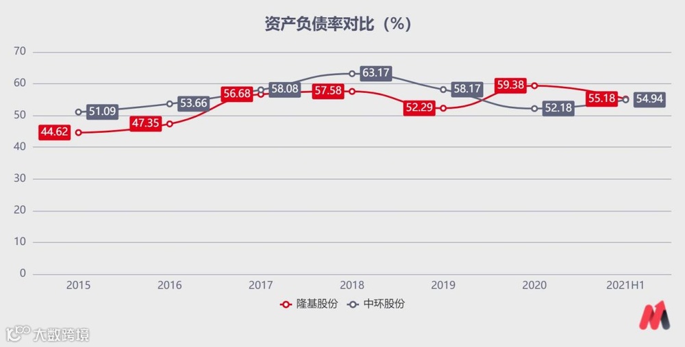 短期偿债能力方面,中环略低于隆基。长期偿债能力方面,中环的资产负债率从2020年的52.18%上升至54.94%,而隆基则从59.38%下降到55.18%。