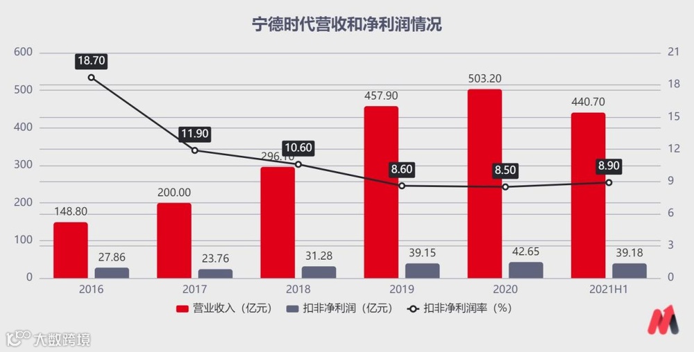 宁德时代上半年实现营业收入440.75亿元,同比增长了134.07%;实现归母净利润44.84亿元,同比增长131.45%,扣非净利润为39.18亿元,扣非净利率8.9%,比2019、2020两年略有上升,止住了颓势。
