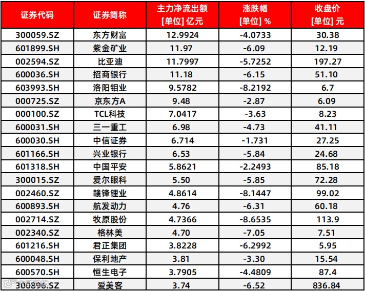 主力净流出前二十:
