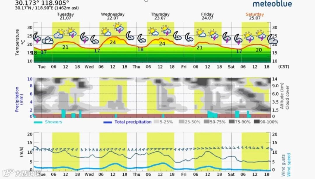 在拍摄彗星前需要查询好天气以及机位。使用meteoblue软件查询到只有在周三的晚上天空中只有少许高云,对彗星干扰较少,拍摄比较理想。