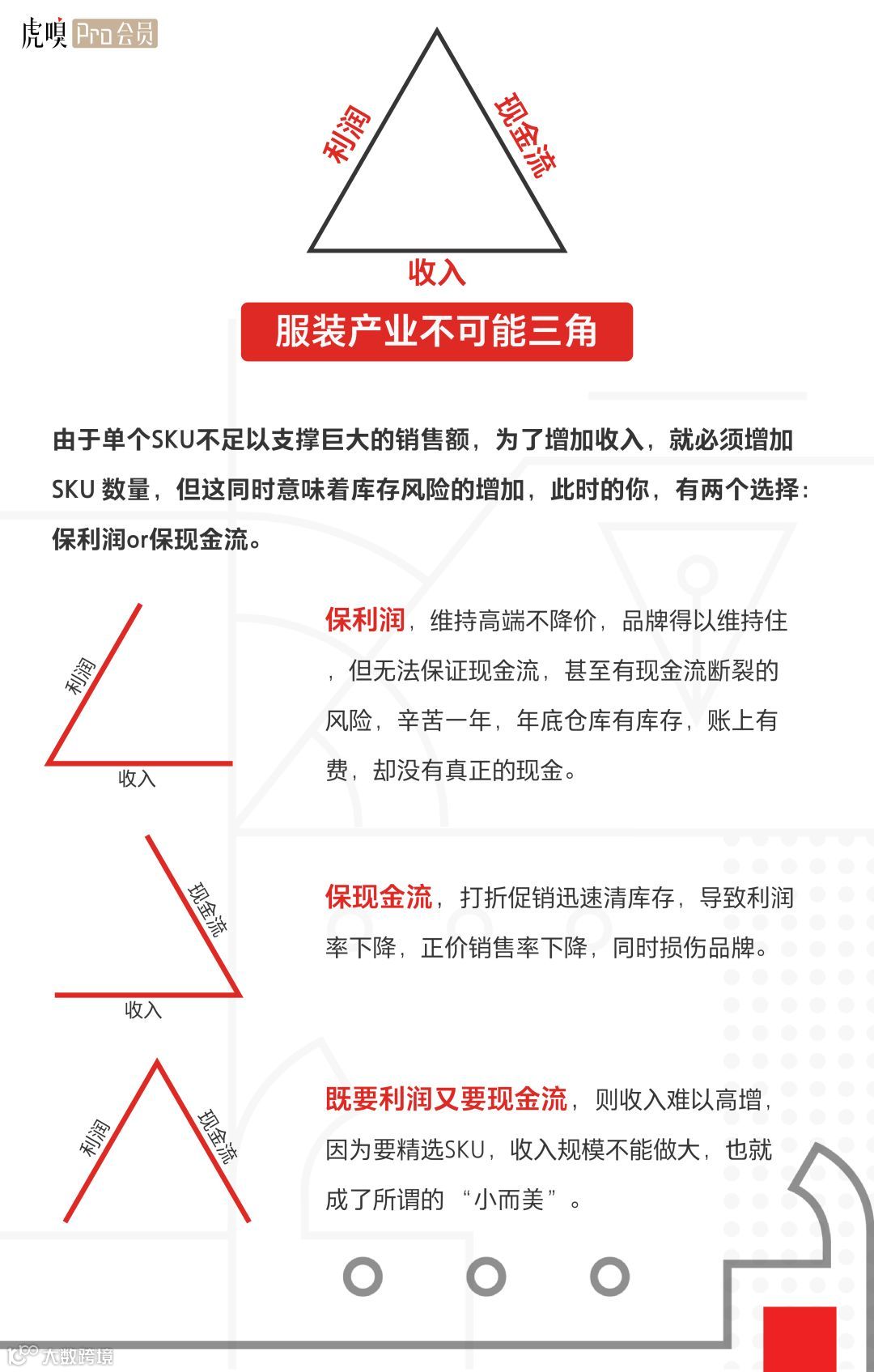 当收入增加的时候,单个SKU不能够支撑很大的销售额,所以必须增加SKU的数量,但除非做了一些商业模式的创新,增加SKU就意味着由于预测失败卖不出去的风险增高。这个时候你有两个选择,要么保利润,要么保现金流。你保利润的话,我就不降价死扛着品牌撑面子,就是高端不降价。这个时候,你可以把品牌维持住,但你的现金流不行,甚至有可能公司的现金流立马就断了,然后作为一个老板,辛苦干了一年,年底就只有仓库的库存,账上有费,实际上没有真正的现金;要么是你保现金流,迅速清库存,但是就会导致利润率下降,正价销售率就降了,同时又损伤品牌;假使同时要现金流和利润这两个,收入就不可能很高,因为这样就意味着要精选SKU,现金流和利润是可以保持的,但收入规模就不能做很大,也就成了所谓的小而美。