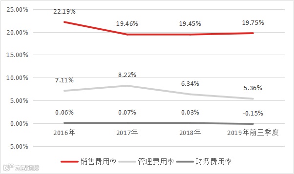 2019年前三季度,良品铺子的销售费用率略有上升,上涨至了19.75%;同期的管理费用进一步下调至5.36%,进一步促进了净利率的提升。