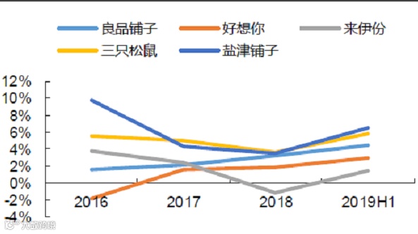目前,良品铺子的总营收仍在较快增长。2016-2018年,公司总营收从42.89亿元增长至63.78亿元,CARG(年复合增长率)为14.14%,明显跑赢行业整体水平(休闲零食同期CARG约为4.13%)。不过从趋势上看,公司的增长已经明显放缓,从2016年的36.20%下降至2018年的17.58%。