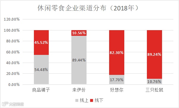 良品铺子的特点在于,公司是目前线上线下营收比例最平衡的休闲零食企业。三只松鼠主要统治线上,来伊份则发力线下,2018年三只松鼠线上、线下营收占比82.30%、17.70%,来伊份线上、线下营收占比10.56%、89.44%。好想你(百草味)对线上收入的依赖度也较高(线上线下比约为4:1)。