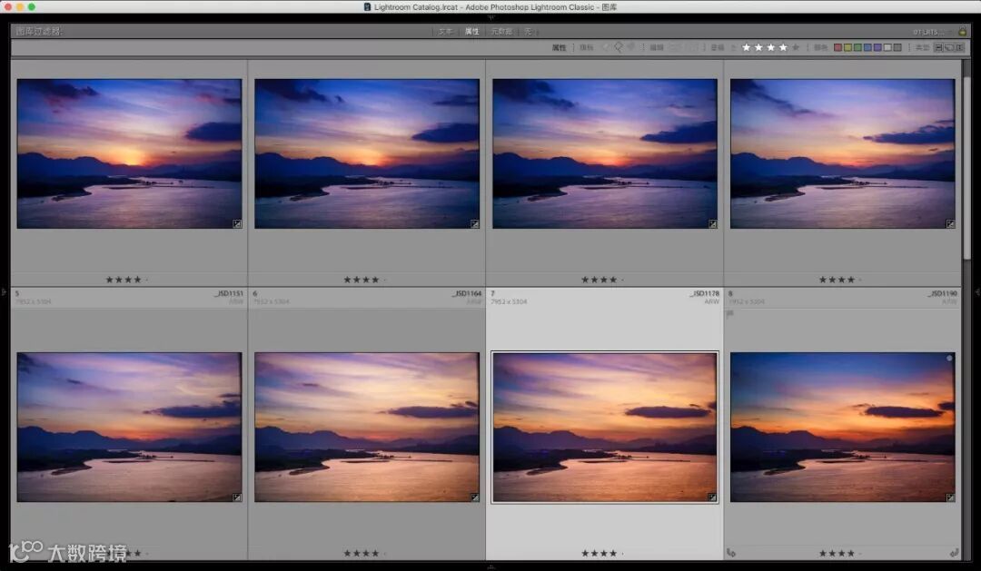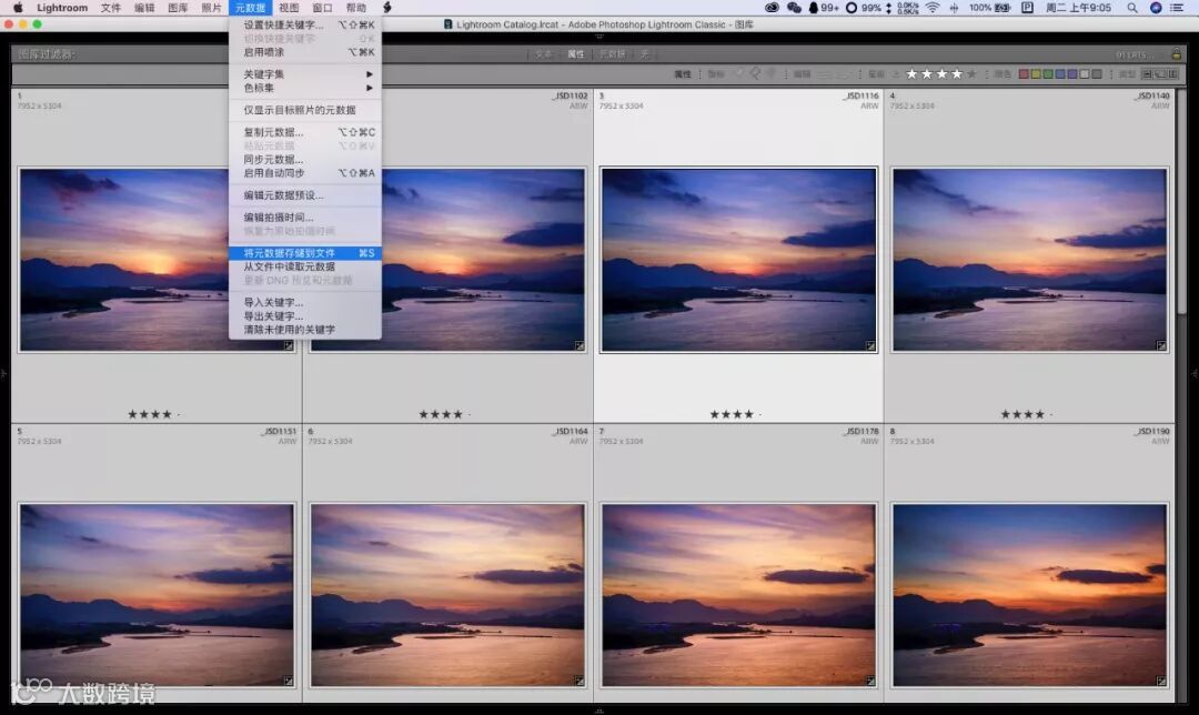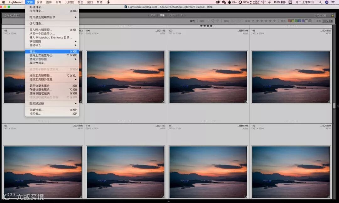 然后你就可以看到,你所有的RAW,一共232张,都修图完成了。接下来,要开始导出到LRT了。按一下CAMOND+a全选所有照片,再找到导出菜单。
