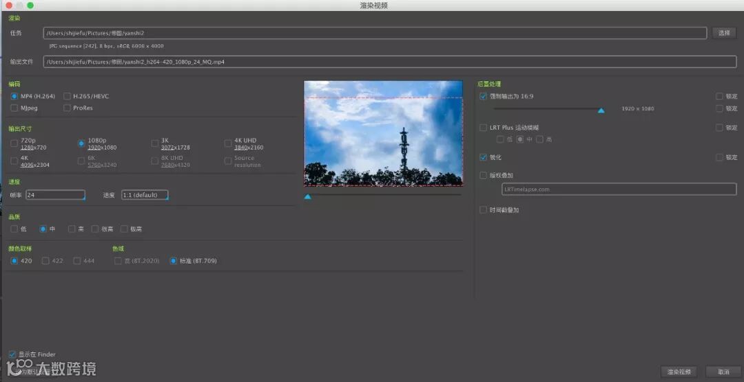 导出完成后,系统会自动跳转到LRT的渲染视频界面。选择相应的输出选项,点击渲染视频,来获得这段延时摄影的视频。