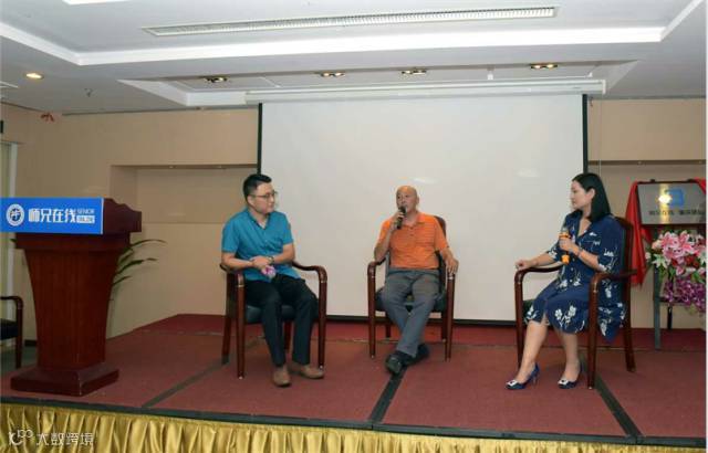 非常小器--梁伯强和李睿教授、肇庆驿站负责人在台上接受企业家们的提问和分享企业经营经验。