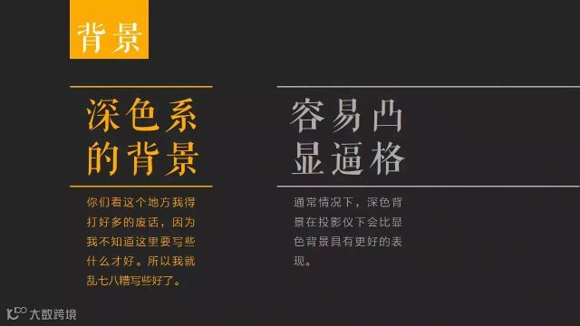 深色系背景逼格更高,同时受制于投影仪的性能,通常深色背景在投影时会比浅色背景具有更好的表现。