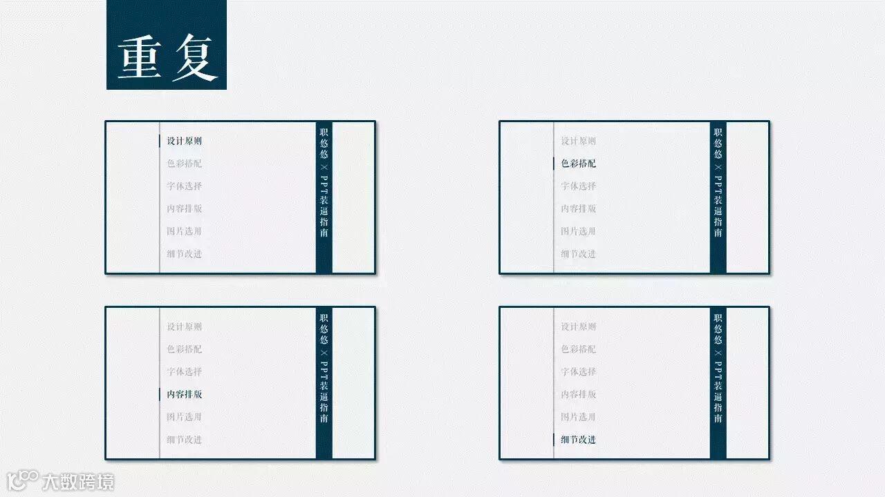 重复是指在整个PPT中,可以重复使用同一色彩,形状,字体等设计要素,增加整体的条理性与统一性。