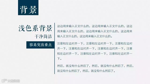 PPT要大胆留白,当然,留白不是说不去设计,而是要在看上去内容很少的同时,让人感到更加舒服。