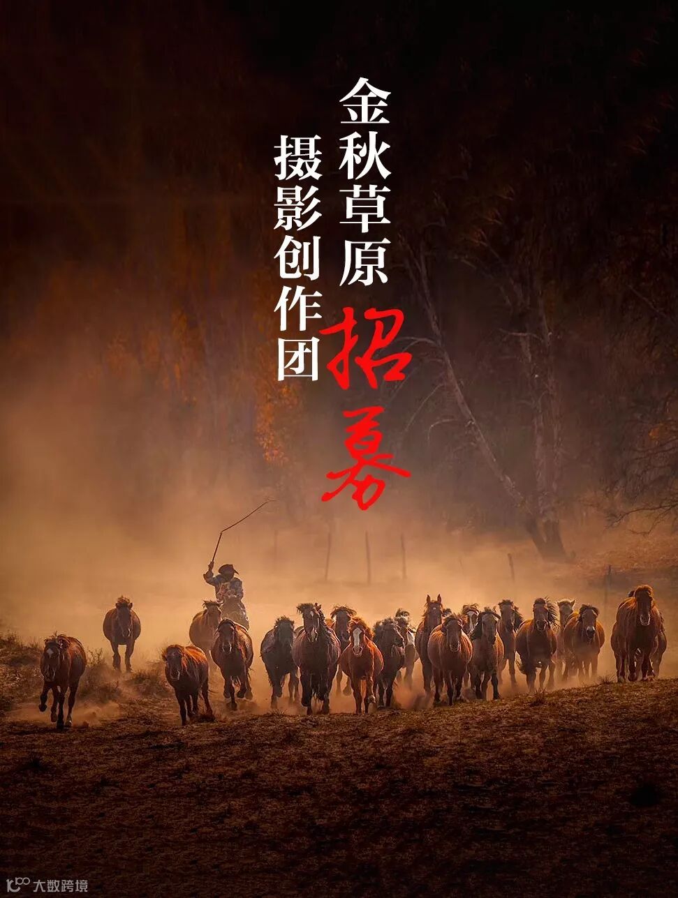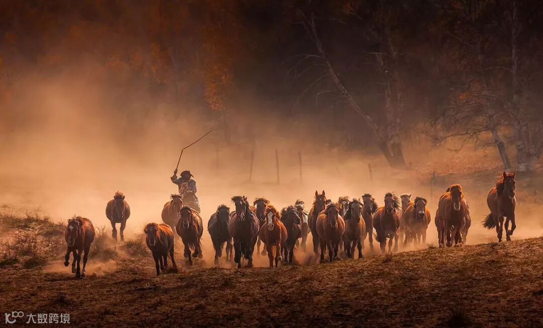 下午:一道沟,金黄色白桦林光影下的【环境人像】【万马奔腾】200至250匹,夕阳剪影,直至日落。
