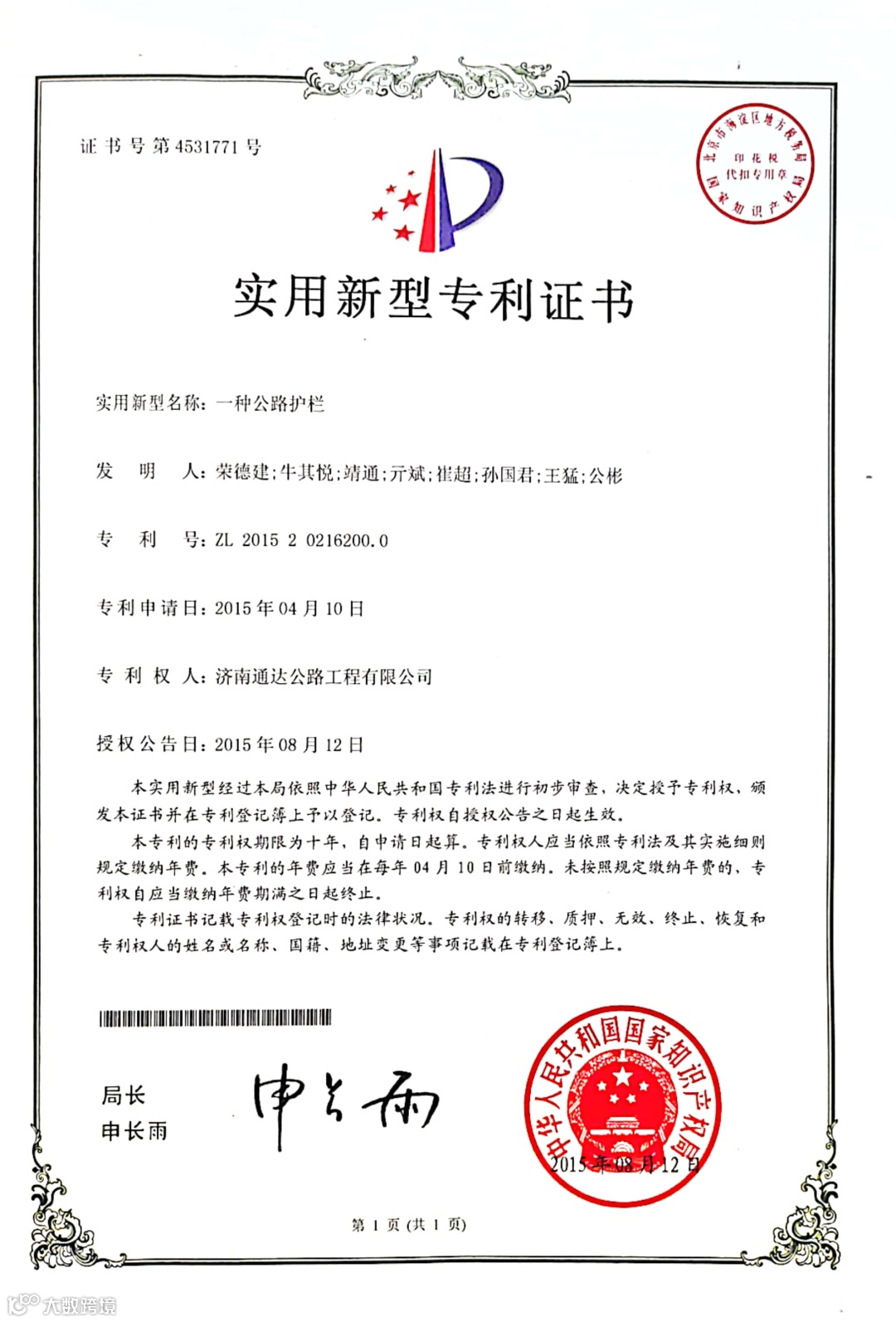 2015年,S241垛庄段水泥混凝土路面施工中,在建道路施工前一侧已安装好水泥混凝土护栏,护栏所在的位置无法安装模板,影响新铺道路振动梁施工。身为项目经理的荣德建,捧着图纸琢磨起来,既然护栏安好了,那能不能把护栏当模板,把振动梁架在护栏上?说干就干,他集结技术、生产人员开会讨论研究,制作一个振动梁支架一边担在护栏上,一边支在模板上。反复设计调试后的支架振动梁在施工现场“大显身手”,荣德建将施工制约难题变为“解题思路”,顺利完成施工任务,该技术成功申请了实用新型专利。