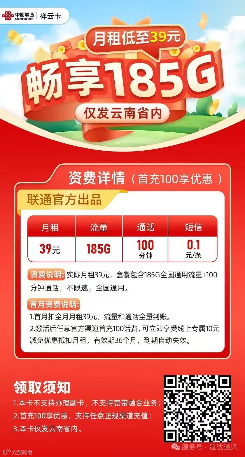 在云南用户可领取185G流量