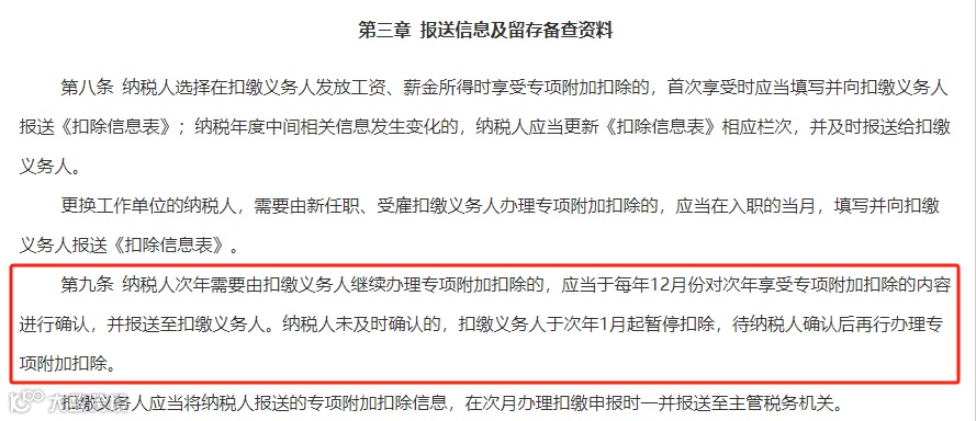 根据国家税务总局发布的关于修订《个人所得税专项附加扣除操作办法(试行)》的公告,纳税人需要每年的12月对次年的专项附加扣除信息予以确认。
