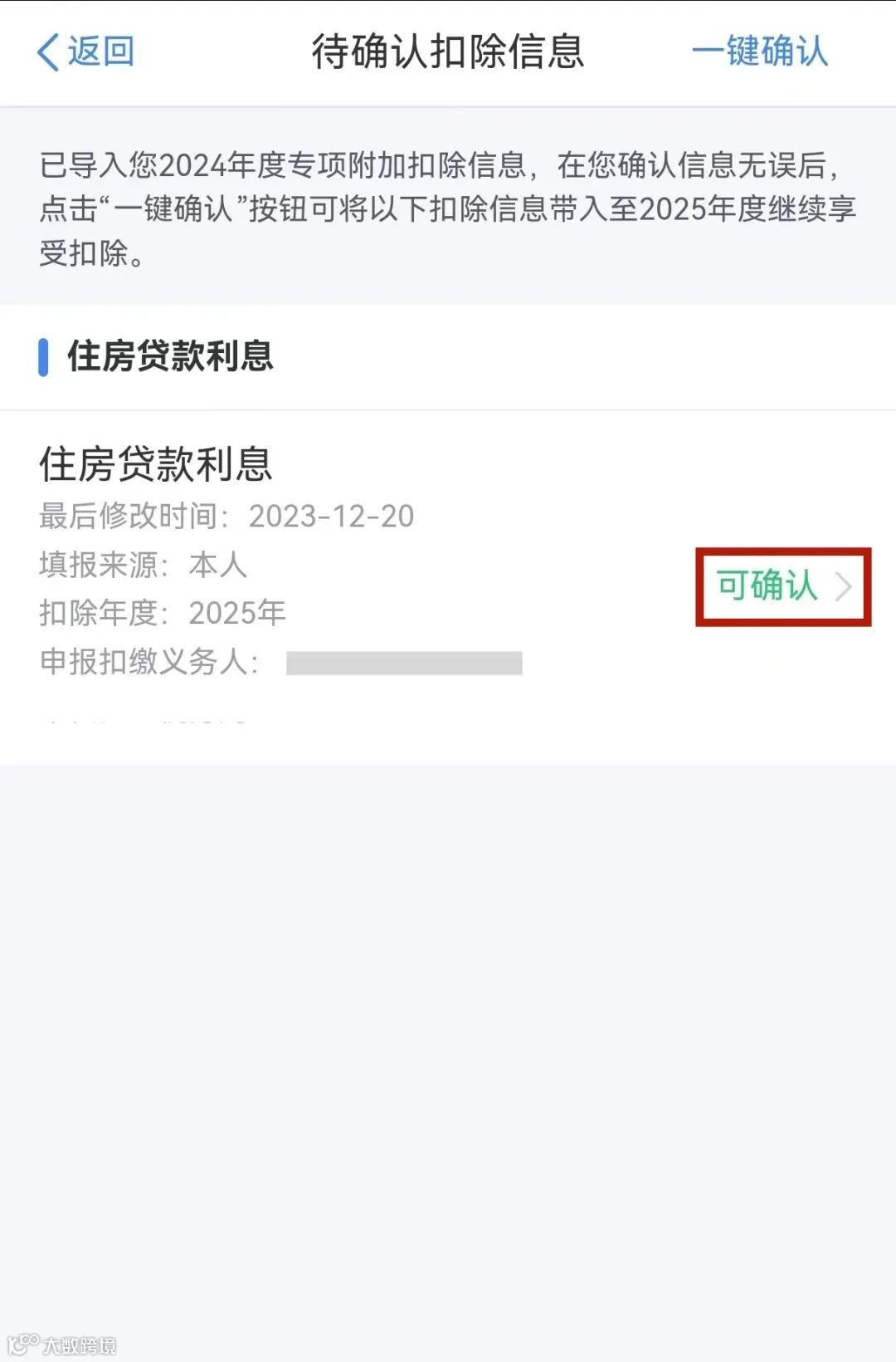 进入待确认扣除信息界面,点击“可确认”核对信息,完成信息确认后,点击“一键确认”,系统将提示您本次填写的信息会对2025年度已填报的信息完成覆盖,确认无误点击“确认”,即可完成提交。