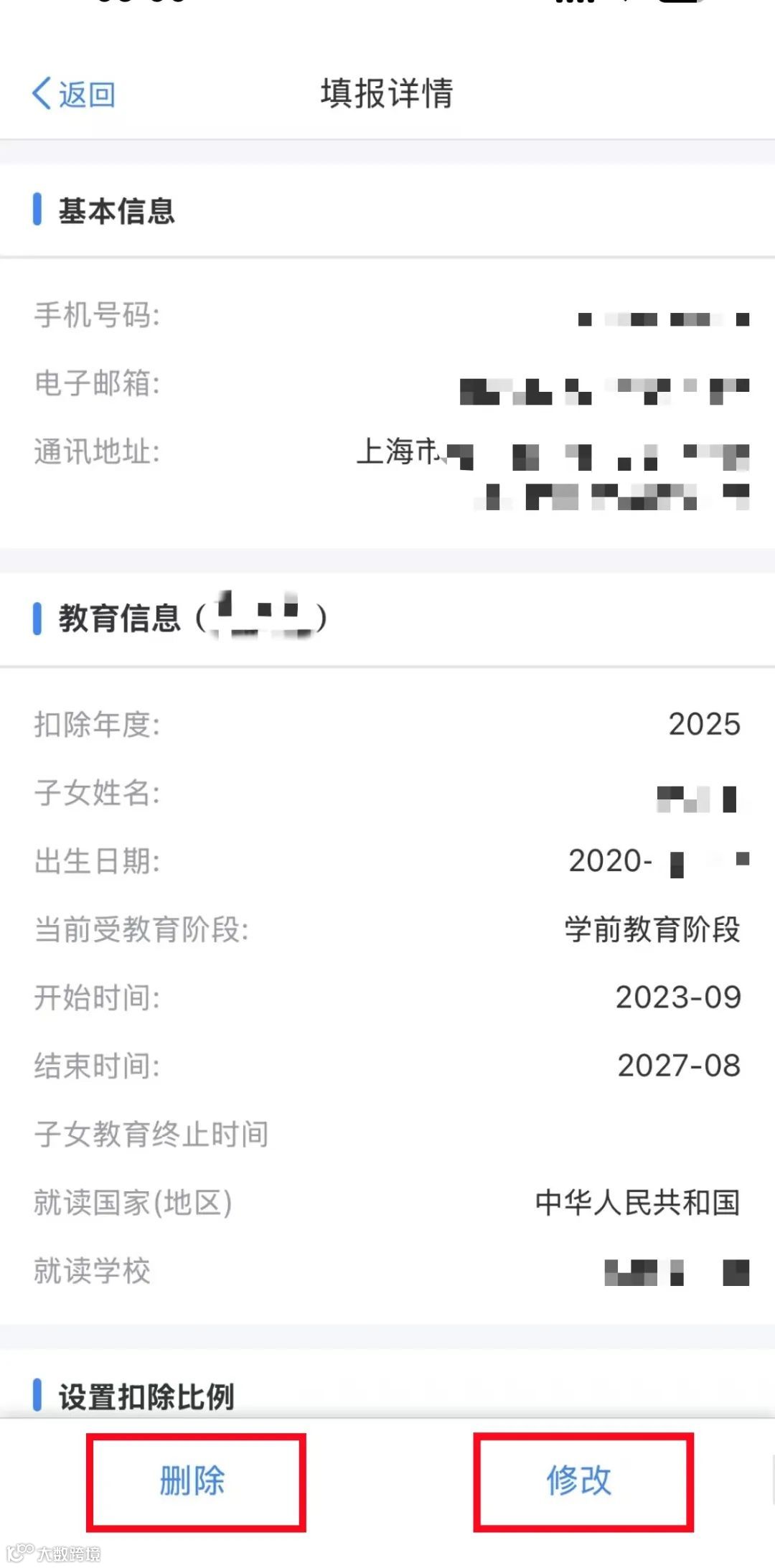 当需要修改2025年度个税专项附加扣除申报方式、扣除比例、相关信息等内容时,您可在待确认扣除信息界面,选择相关扣除项目,点击“可确认”,在填报详情中对该专项附加扣除项目进行“删除”或“修改”等操作。