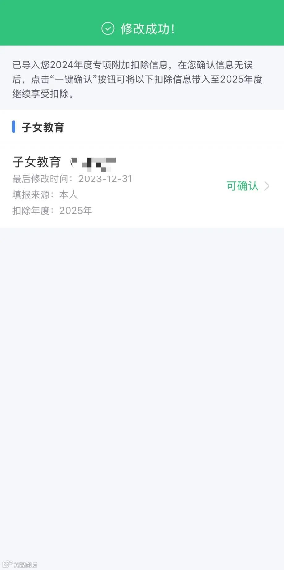 完成后,如您2025年还有其他继续享受的专项附加扣除,可按照【情形一】的相关步骤,点击“一键确认”完成信息提交。