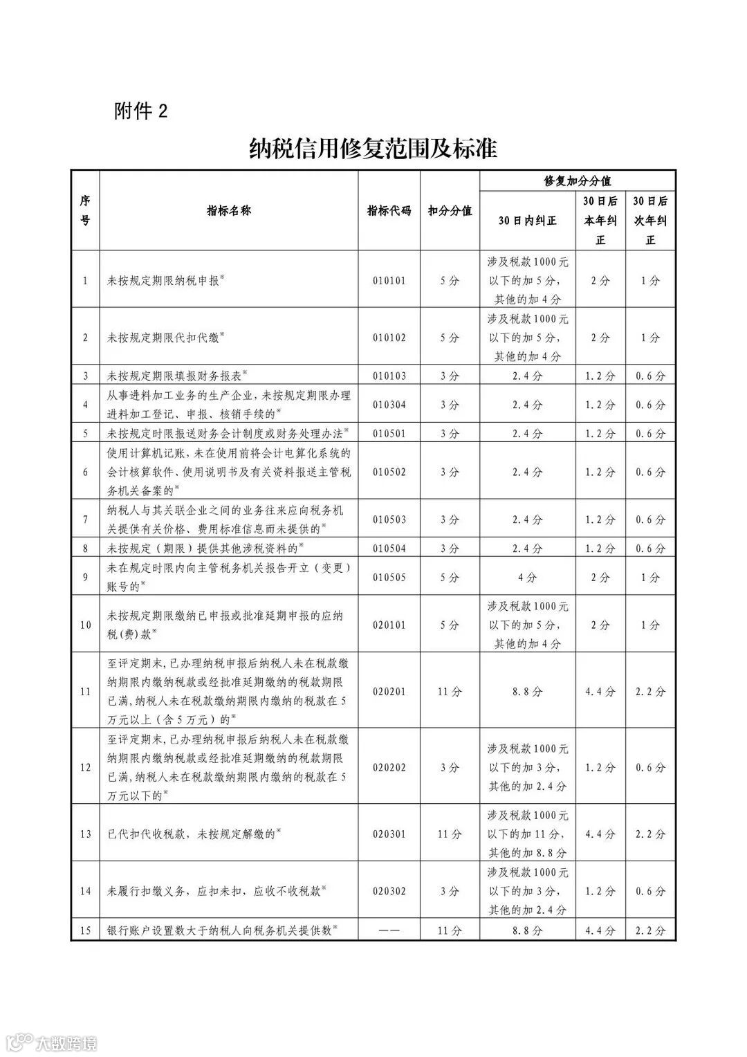 其中,对于未按法定期限办理纳税申报、资料备案等事项,符合条件的破产重整企业申请纳税信用修复时,统一按照“30日内纠正”对应的修复标准进行加分;对于部分纳税信用直接判为D级的严重失信行为,符合条件的破产重整企业申请纳税信用修复时,不受申请前连续12个月没有新增纳税信用失信行为记录的条件限制。相关指标已在《纳税信用修复范围及标准》中用※进行标注。