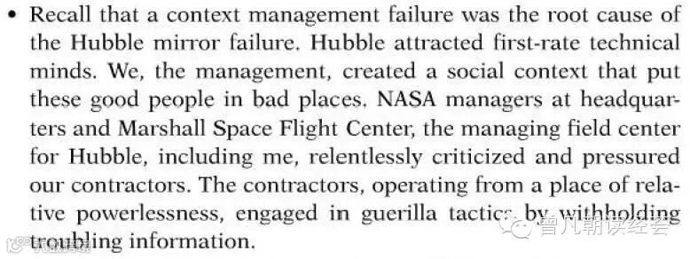 ●回顾起来,哈勃瑕疵镜片的根本原因在于背景管理失败。哈勃项目引进了一流的人才,而我们这些管理者所创造出的社会背景,却让这些人才无用武之地。NASA总部以及为NASA管理哈勃场地的马歇尔太空飞行中心的经理们,再加上我本人在内,不停地向承包商指责施压。于是这些承包商在无权无力的情况下,采取了游击战术,也就是隐瞒问题信息。