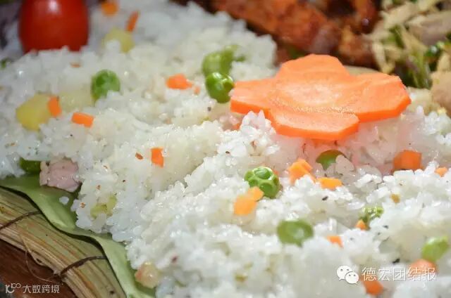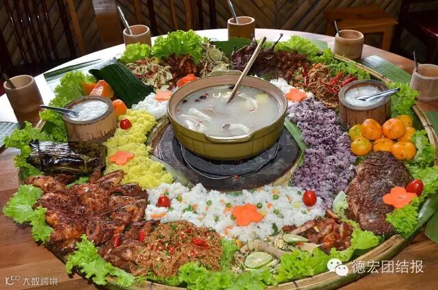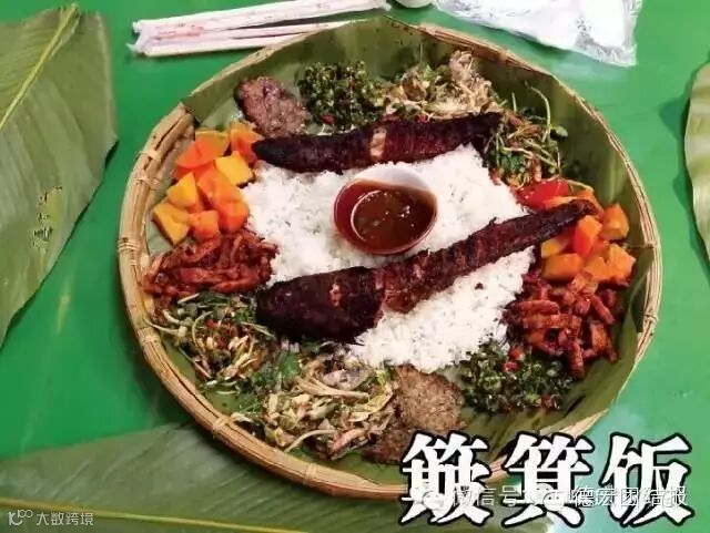 手抓饭不仅是德宏少数民族景颇族餐饮文化的代表作,也是人们“回归自然、绿色环保”餐饮理念的最好见证。手抓饭最早演变自景颇族的绿叶宴,是景颇族为了庆祝丰收的喜庆宴,大家围坐一起,以绿叶当碗,以手做筷,除了有“团圆、和谐、欢乐”等美好的寓意之外,吃手抓饭的过程别有一番味道。