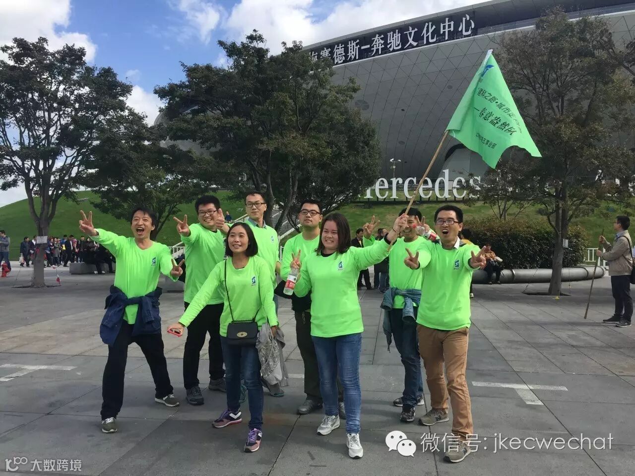 在完成大组集体照之后,烈日灼心队抢先出发。为了节省时间大家均选择出租车作为交通工具,这时候领导的作用就最大程度体现出来了,一部分成员随领导出发,另一部分成员做出租车奔现第一个集结点——上海中心。根据任务卡要求所有小组成员举着建科标志旗帜与上海中心合影,其中接触地面的脚要比人数少两只。任务完成后由组长将照片发至“城市定向”微信群,由群中工作人员审核通过后。期间,各小组纷纷大发奇想,有的组背着团队成员;有的组架着团队成员大腿;有的组倚靠栏杆……而我们队因地制宜,所有成员坐在花坛边上,轻松的抬起脚,仿佛对其他组宣战:看这么容易的事,我们赢定了。更有取巧的小组烈日灼心队直接奔向下一个项目地,同样以上海中心为背景完成了拍摄任务。