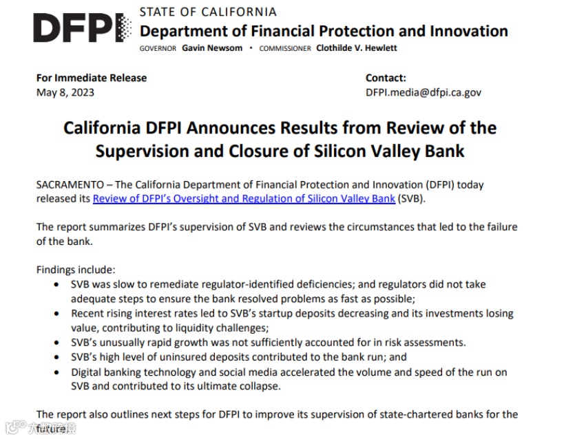 当地时间5月8日,加州金融保护与创新部(DFPI)发布报告承认,未能在硅谷银行倒闭之前向该行领导层施压,要求其尽快解决已知问题。